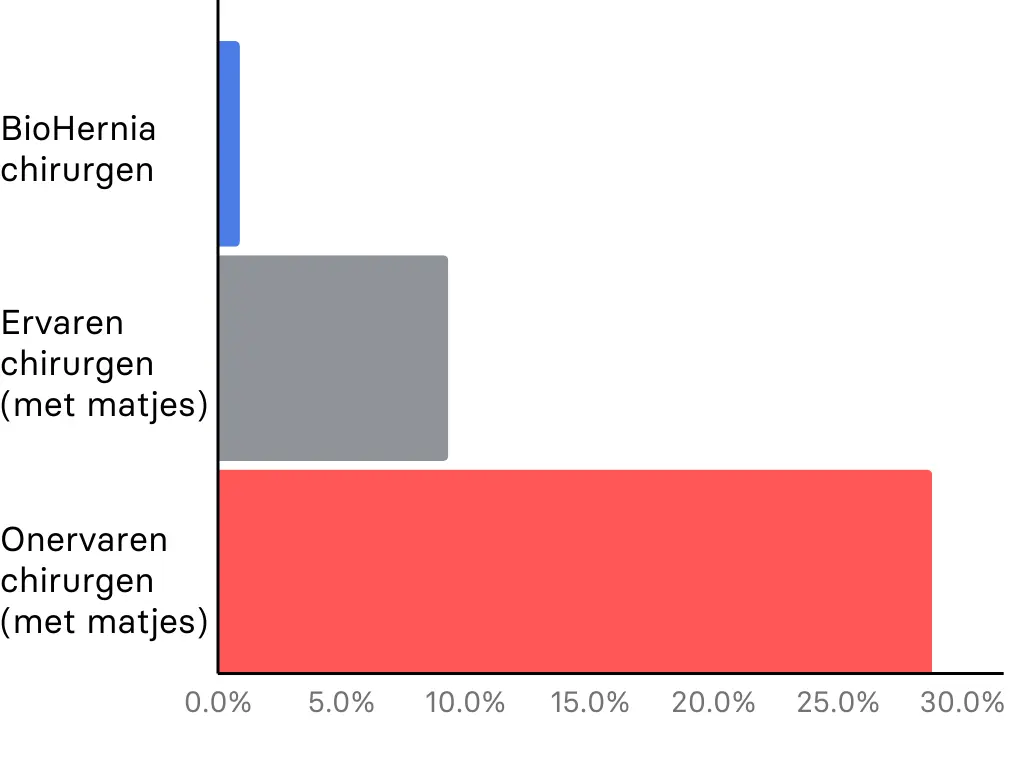 Het feit dat zelfs ervaren chirurgen die de Lichtenstein-methode met netje toepassen aanzienlijke percentages chronische pijn kunnen voortbrengen, onderstreept het belang van onze focus op operaties zonder netjes, die deze risico’s voor u minimaliseren.